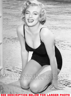 YOU ARE PURCHASING 1 CANDID & RARE MARILYN MONROE POOLSIDE BEAUTY (1) 8x10 FINE ART PHOTO The (1) 8x10 Candid & Fine Art Photo you will receive, (shown below) is from a Private Collection. COPYRIGHTS: (please see bottom of thispage) This Candid, One of a kind picture is Professionally photo-printed utilizing the GICLEE printing process onto GALERIE SmoothGloss Archival & Acid-free High Resolution Photo-Lab quality paper. As well, we use only Giclee pressheated Archival Printing Inks. This is Kodak's most expensive Ink, which creates higher & more vivid quality Photos & longer lasting prints than any other Photographic Ink in the world!! This Ultra Premium Kodak Super Color/Photo Gloss Pigment Based Printing Ink also shields photos from the key factors that lead to fading such as light, air, pollution, moisture and heat. This is due to the Spectacularly Innovative "colorlast" technology applied to this KodakPIGMENTInk, which allows your Photo to virtually resist any picture fading for at least 100 years. Meaning, the vibrant colors in the Photo you see below will be the exact same vibrant colors your descendants will see when viewing your Photo 100 years from now! NOTE PLEASE** WE ARE ALWAYS LISTING DIFFERENT MARILYN MONROE PHOTOS & PHOTO CREATIONS. IFYOU WOULD LIKE TO BE NOTIFIED THE NEXT TIME WE LIST MORE UNIQUE AND DIFFERENT PHOTOS OF MARILYN MONROE PLEASE EMAIL US  8x10 PHOTO#1 CLICK HERE TO VIEW MORE MARILYN MONROE 8x10PHOTOS!