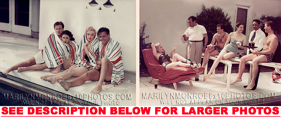 YOUARE PURCHASING 2 CANDID & RARE MARILYN MONROE POOLSIDE withFRIENDS (2) 8x10 FINE ART PHOTOS The (2) 8x10 Candid & Fine Art Photos you willreceive, (shown below) are from a Private Collection. COPYRIGHTS: (please see bottom of thispage) These Candid, One of a kind pictures are Professionally photo-printed utilizing the GICLEE printing process onto GALERIE SmoothGloss Archival & Acid-free High Resolution Photo-Lab quality paper. As well, we use only Giclee pressheated Archival Printing Inks. This is Kodak's most expensive Ink, which creates higher & more vivid quality Photos & longer lasting prints than any other Photographic Ink in the world!! This Ultra Premium Kodak Super Color/Photo Gloss Pigment Based Printing Ink also shields photos from the key factors that lead to fading such as light, air, pollution, moisture and heat. This is due to the Spectacularly Innovative "colorlast" technology applied to this KodakPIGMENTInk, which allows your Photos to virtually resist any picture fading for at least 100 years. Meaning, the vibrant colors in the Photos you see below will be the exact same vibrant colors your descendants will see when viewing your Photos 100 years from now! NOTE PLEASE** WE ARE ALWAYS LISTING DIFFERENT MARILYN MONROE PHOTOS & PHOTO CREATIONS. IFYOU WOULD LIKE TO BE NOTIFIED THE NEXT TIME WE LIST MORE UNIQUE AND DIFFERENT PHOTOS OF MARILYN MONROE PLEASE EMAIL US  8x10 PHOTO#1  8x10 PHOTO#2  CLICK HERE TO VIEW MORE MARILYN MONROE 8x10PHOTOS!