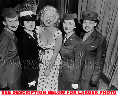 YOU ARE PURCHASING 1 CANDID & RARE MARILYN MONROE POSING with TROOPWOMEN (1) 8x10 FINE ART PHOTO The (1) 8x10 Candid & Fine Art Photo you will receive, (shown below) is from a Private Collection. COPYRIGHTS: (please see bottom of thispage) This Candid, One of a kind picture is Professionally photo-printed utilizing the GICLEE printing process onto GALERIE SmoothGloss Archival & Acid-free High Resolution Photo-Lab quality paper. As well, we use only Giclee pressheated Archival Printing Inks. This is Kodak's most expensive Ink, which creates higher & more vivid quality Photos & longer lasting prints than any other Photographic Ink in the world!! This Ultra Premium Kodak Super Color/Photo Gloss Pigment Based Printing Ink also shields photos from the key factors that lead to fading such as light, air, pollution, moisture and heat. This is due to the Spectacularly Innovative "colorlast" technology applied to this KodakPIGMENTInk, which allows your Photo to virtually resist any picture fading for at least 100 years. Meaning, the vibrant colors in the Photo you see below will be the exact same vibrant colors your descendants will see when viewing your Photo 100 years from now! NOTE PLEASE** WE ARE ALWAYS LISTING DIFFERENT MARILYN MONROE PHOTOS & PHOTO CREATIONS. IFYOU WOULD LIKE TO BE NOTIFIED THE NEXT TIME WE LIST MORE UNIQUE AND DIFFERENT PHOTOS OF MARILYN MONROE PLEASE EMAIL US  8x10 PHOTO#1 CLICK HERE TO VIEW MORE MARILYN MONROE 8x10PHOTOS!