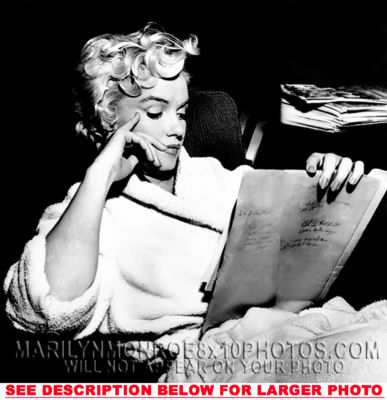 YOU ARE PURCHASING 1 CANDID & RARE MARILYN MONROE SCRIPT READER (1) 8x10 FINE ART PHOTO The (1) 8x10 Candid & Fine Art Photo you will receive, (shown below) is from a Private Collection. COPYRIGHTS: (please see bottom of thispage) This Candid, One of a kind picture is Professionally photo-printed utilizing the GICLEE printing process onto GALERIE SmoothGloss Archival & Acid-free High Resolution Photo-Lab quality paper. As well, we use only Giclee pressheated Archival Printing Inks. This is Kodak's most expensive Ink, which creates higher & more vivid quality Photos & longer lasting prints than any other Photographic Ink in the world!! This Ultra Premium Kodak Super Color/Photo Gloss Pigment Based Printing Ink also shields photos from the key factors that lead to fading such as light, air, pollution, moisture and heat. This is due to the Spectacularly Innovative "colorlast" technology applied to this KodakPIGMENTInk, which allows your Photo to virtually resist any picture fading for at least 100 years. Meaning, the vibrant colors in the Photo you see below will be the exact same vibrant colors your descendants will see when viewing your Photo 100 years from now! NOTE PLEASE** WE ARE ALWAYS LISTING DIFFERENT MARILYN MONROE PHOTOS & PHOTO CREATIONS. IFYOU WOULD LIKE TO BE NOTIFIED THE NEXT TIME WE LIST MORE UNIQUE AND DIFFERENT PHOTOS OF MARILYN MONROE PLEASE EMAIL US  8x10 PHOTO#1 CLICK HERE TO VIEW MORE MARILYN MONROE 8x10PHOTOS!