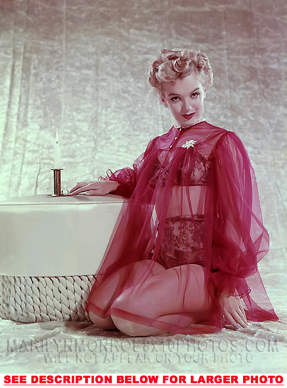 YOU ARE PURCHASING 1 CANDID & RARE MARILYN MONROE SEETHRU NIGHTIE SHOOT (1) 8x10 FINE ART PHOTO The (1) 8x10 Candid & Fine Art Photo you will receive, (shown below) is from a Private Collection. COPYRIGHTS: (please see bottom of thispage) This Candid, One of a kind picture is Professionally photo-printed utilizing the GICLEE printing process onto GALERIE SmoothGloss Archival & Acid-free High Resolution Photo-Lab quality paper. As well, we use only Giclee pressheated Archival Printing Inks. This is Kodak's most expensive Ink, which creates higher & more vivid quality Photos & longer lasting prints than any other Photographic Ink in the world!! This Ultra Premium Kodak Super Color/Photo Gloss Pigment Based Printing Ink also shields photos from the key factors that lead to fading such as light, air, pollution, moisture and heat. This is due to the Spectacularly Innovative "colorlast" technology applied to this KodakPIGMENTInk, which allows your Photo to virtually resist any picture fading for at least 100 years. Meaning, the vibrant colors in the Photo you see below will be the exact same vibrant colors your descendants will see when viewing your Photo 100 years from now! NOTE PLEASE** WE ARE ALWAYS LISTING DIFFERENT MARILYN MONROE PHOTOS & PHOTO CREATIONS. IFYOU WOULD LIKE TO BE NOTIFIED THE NEXT TIME WE LIST MORE UNIQUE AND DIFFERENT PHOTOS OF MARILYN MONROE PLEASE EMAIL US  8x10 PHOTO#1 CLICK HERE TO VIEW MORE MARILYN MONROE 8x10PHOTOS!