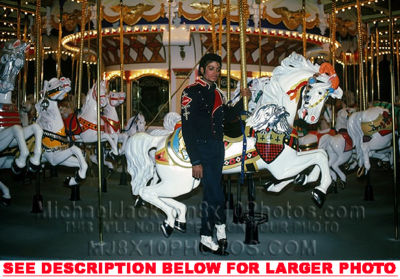 YOU ARE PURCHASING 1 CANDID & RARE MICHAEL JACKSON NEVERLAND CAROUSEL (1) 8x10 FINE ART PHOTO The (1) 8x10 Candid & Fine Art Photo you will receive, (shown below) is from a Private Collection. COPYRIGHTS: (please see bottom of thispage) This Candid, One of a kind picture is Professionally photo-printed utilizing the GICLEE printing process onto GALERIE SmoothGloss Archival & Acid-free High Resolution Photo-Lab quality paper. As well, we use only Giclee pressheated Archival Printing Inks. This is Kodak's most expensive Ink, which creates higher & more vivid quality Photos & longer lasting prints than any other Photographic Ink in the world!! This Ultra Premium Kodak Super Color/Photo Gloss Pigment Based Printing Ink also shields photos from the key factors that lead to fading such as light, air, pollution, moisture and heat. This is due to the Spectacularly Innovative "colorlast" technology applied to this KodakPIGMENTInk, which allows your Photo to virtually resist any picture fading for at least 100 years. Meaning, the vibrant colors in the Photo you see below will be the exact same vibrant colors your descendants will see when viewing your Photo 100 years from now! NOTE PLEASE** WE ARE ALWAYS LISTING DIFFERENT MICHAEL JACKSON PHOTOS & PHOTO CREATIONS. IFYOU WOULD LIKE TO BE NOTIFIED THE NEXT TIME WE LIST MORE UNIQUE AND DIFFERENT PHOTOS OF MICHAEL JACKSON PLEASE EMAIL US  8x10 PHOTO#1 CLICK HERE TO VIEW MORE MICHAEL JACKSON 8x10PHOTOS!