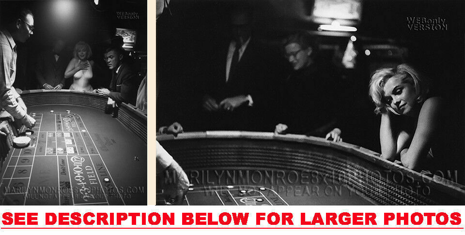 YOUARE PURCHASING 2 CANDID & RARE MARILYN MONROE at the CRAPS TABLE (2) 8x10 FINE ART PHOTOS The (2) 8x10 Candid & Fine Art Photos you will receive, (shown below) are from a Private Collection. COPYRIGHTS: (please see bottom of thispage) These Candid, One of a kind pictures are Professionally photo-printed utilizing the GICLEE printing process onto GALERIE SmoothGloss Archival & Acid-free High Resolution Photo-Lab quality paper. As well, we use only Giclee pressheated Archival Printing Inks. This is Kodak's most expensive Ink, which creates higher & more vivid quality Photos & longer lasting prints than any other Photographic Ink in the world!! This Ultra Premium Kodak Super Color/Photo Gloss Pigment Based Printing Ink also shields photos from the key factors that lead to fading such as light, air, pollution, moisture and heat. This is due to the Spectacularly Innovative "colorlast" technology applied to this KodakPIGMENTInk, which allows your Photos to virtually resist any picture fading for at least 100 years. Meaning, the vibrant colors in the Photos you see below will be the exact same vibrant colors your descendants will see when viewing your Photos 100 years from now! NOTE PLEASE** WE ARE ALWAYS LISTING DIFFERENT MARILYN MONROE PHOTOS & PHOTO CREATIONS. IFYOU WOULD LIKE TO BE NOTIFIED THE NEXT TIME WE LIST MORE UNIQUE AND DIFFERENT PHOTOS OF MARILYN MONROE PLEASE EMAIL US  8x10 PHOTO#1 8x10 PHOTO#2 CLICK HERE TO VIEW MORE MARILYN MONROE 8x10PHOTOS!