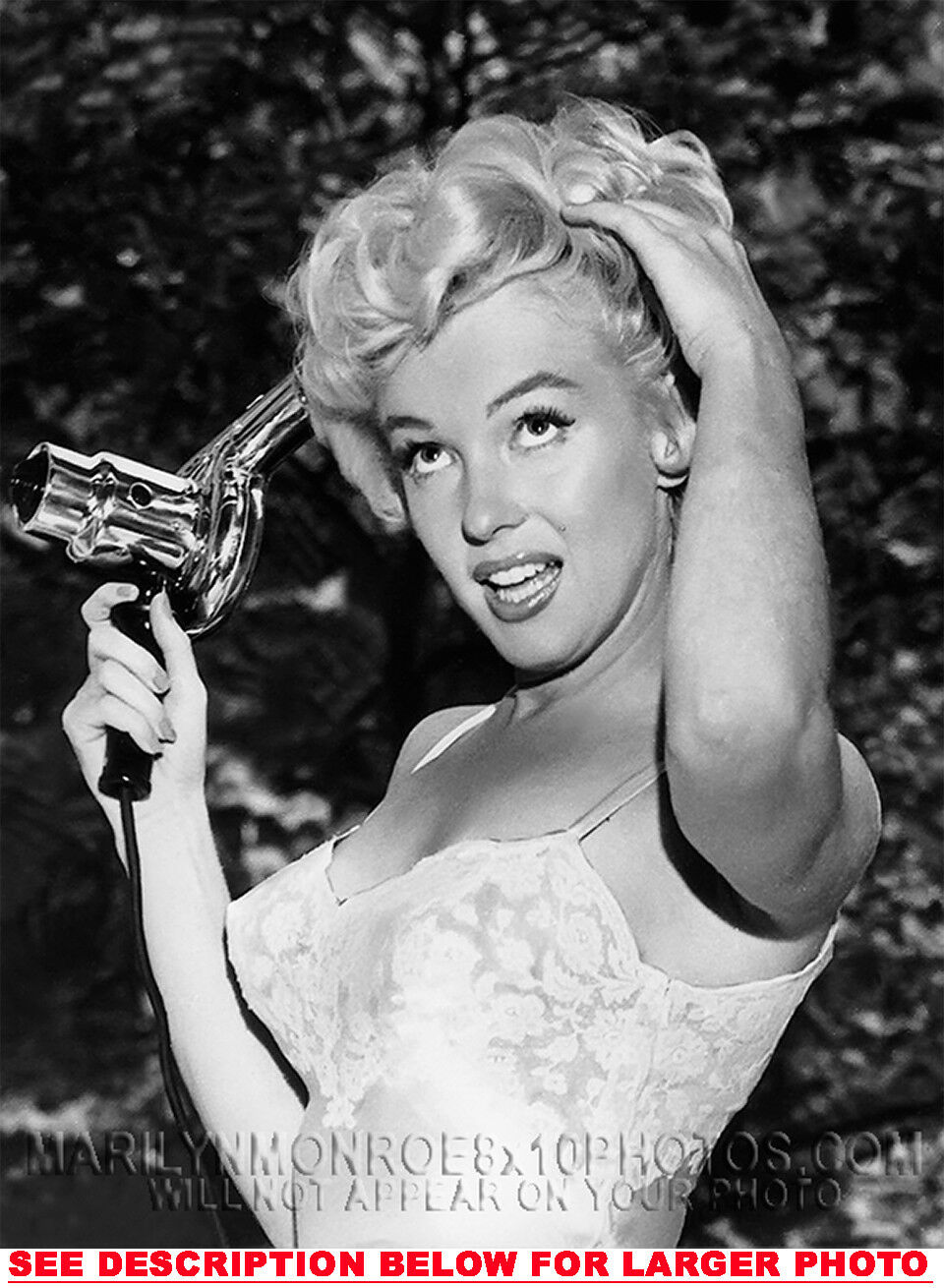YOU ARE PURCHASING 1 CANDID & RARE MARILYN MONROE BLOWDRYING IN NEGLIGEE (1) 5X7 FINE ART PHOTO The (1) 5X7 Candid & Fine Art Photo you will receive, (shown below) is from a Private Collection. COPYRIGHTS: (please see bottom of thispage) This Candid, One of a kind picture is Professionally photo-printed utilizing the GICLEE printing process onto GALERIE SmoothGloss Archival & Acid-free High Resolution Photo-Lab quality paper. As well, we use only Giclee pressheated Archival Printing Inks. This is Kodak's most expensive Ink, which creates higher & more vivid quality Photos & longer lasting prints than any other Photographic Ink in the world!! This Ultra Premium Kodak Super Color/Photo Gloss Pigment Based Printing Ink also shields photos from the key factors that lead to fading such as light, air, pollution, moisture and heat. This is due to the Spectacularly Innovative "colorlast" technology applied to this KodakPIGMENTInk, which allows your Photo to virtually resist any picture fading for at least 100 years. Meaning, the vibrant colors in the Photo you see below will be the exact same vibrant colors your descendants will see when viewing your Photo 100 years from now! NOTE PLEASE** WE ARE ALWAYS LISTING DIFFERENT MARILYN MONROE PHOTOS & PHOTO CREATIONS. IFYOU WOULD LIKE TO BE NOTIFIED THE NEXT TIME WE LIST MORE UNIQUE AND DIFFERENT PHOTOS OF MARILYN MONROE PLEASE EMAIL US  5X7 PHOTO#1  CLICK HERE TO VIEW MORE MARILYN MONROE 5X7PHOTOS!