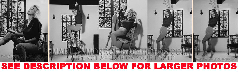 YOU ARE PURCHASING 3 CANDID & RARE MARILYN MONROE CASUAL WEAR AT HOME (3) 8x10 FINE ART PHOTOS The (3) 8x10 Candid & Fine Art Photos you will receive, (shown below) are from a Private Collection. COPYRIGHTS: (please see bottom of thispage) These Candid, One of a kind pictures are Professionally photo-printed utilizing the GICLEE printing process onto GALERIE SmoothGloss Archival & Acid-free High Resolution Photo-Lab quality paper. As well, we use only Giclee pressheated Archival Printing Inks. This is Kodak's most expensive Ink, which creates higher & more vivid quality Photos & longer lasting prints than any other Photographic Ink in the world!! This Ultra Premium Kodak Super Color/Photo Gloss Pigment Based Printing Ink also shields photos from the key factors that lead to fading such as light, air, pollution, moisture and heat. This is due to the Spectacularly Innovative "colorlast" technology applied to this KodakPIGMENTInk, which allows your Photos to virtually resist any picture fading for at least 100 years. Meaning, the vibrant colors in the Photos you see below will be the exact same vibrant colors your descendants will see when viewing your Photos 100 years from now! NOTE PLEASE** WE ARE ALWAYS LISTING DIFFERENT MARILYN MONROE PHOTOS & PHOTO CREATIONS. IFYOU WOULD LIKE TO BE NOTIFIED THE NEXT TIME WE LIST MORE UNIQUE AND DIFFERENT PHOTOS OF MARILYN MONROE PLEASE EMAIL US  8x10 PHOTO#1 8x10 PHOTO#2 8x10 PHOTO#3 CLICK HERE TO VIEW MORE MARILYN MONROE 8x10PHOTOS!