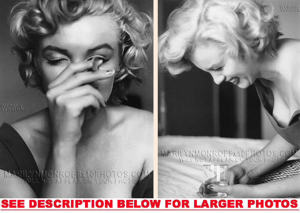 YOUARE PURCHASING 2 CANDID & RARE MARILYN MONROE CLOSEUP with CiGnDRiNK (2) 8x10 FINE ART PHOTOS The (2) 8x10 Candid & Fine Art Photos you will receive, (shown below) are from a Private Collection. COPYRIGHTS: (please see bottom of thispage) These Candid, One of a kind pictures are Professionally photo-printed utilizing the GICLEE printing process onto GALERIE SmoothGloss Archival & Acid-free High Resolution Photo-Lab quality paper. As well, we use only Giclee pressheated Archival Printing Inks. This is Kodak's most expensive Ink, which creates higher & more vivid quality Photos & longer lasting prints than any other Photographic Ink in the world!! This Ultra Premium Kodak Super Color/Photo Gloss Pigment Based Printing Ink also shields photos from the key factors that lead to fading such as light, air, pollution, moisture and heat. This is due to the Spectacularly Innovative "colorlast" technology applied to this KodakPIGMENTInk, which allows your Photos to virtually resist any picture fading for at least 100 years. Meaning, the vibrant colors in the Photos you see below will be the exact same vibrant colors your descendants will see when viewing your Photos 100 years from now! NOTE PLEASE** WE ARE ALWAYS LISTING DIFFERENT MARILYN MONROE PHOTOS & PHOTO CREATIONS. IFYOU WOULD LIKE TO BE NOTIFIED THE NEXT TIME WE LIST MORE UNIQUE AND DIFFERENT PHOTOS OF MARILYN MONROE PLEASE EMAIL US  8x10 PHOTO#1 8x10 PHOTO#2 CLICK HERE TO VIEW MORE MARILYN MONROE 8x10PHOTOS!