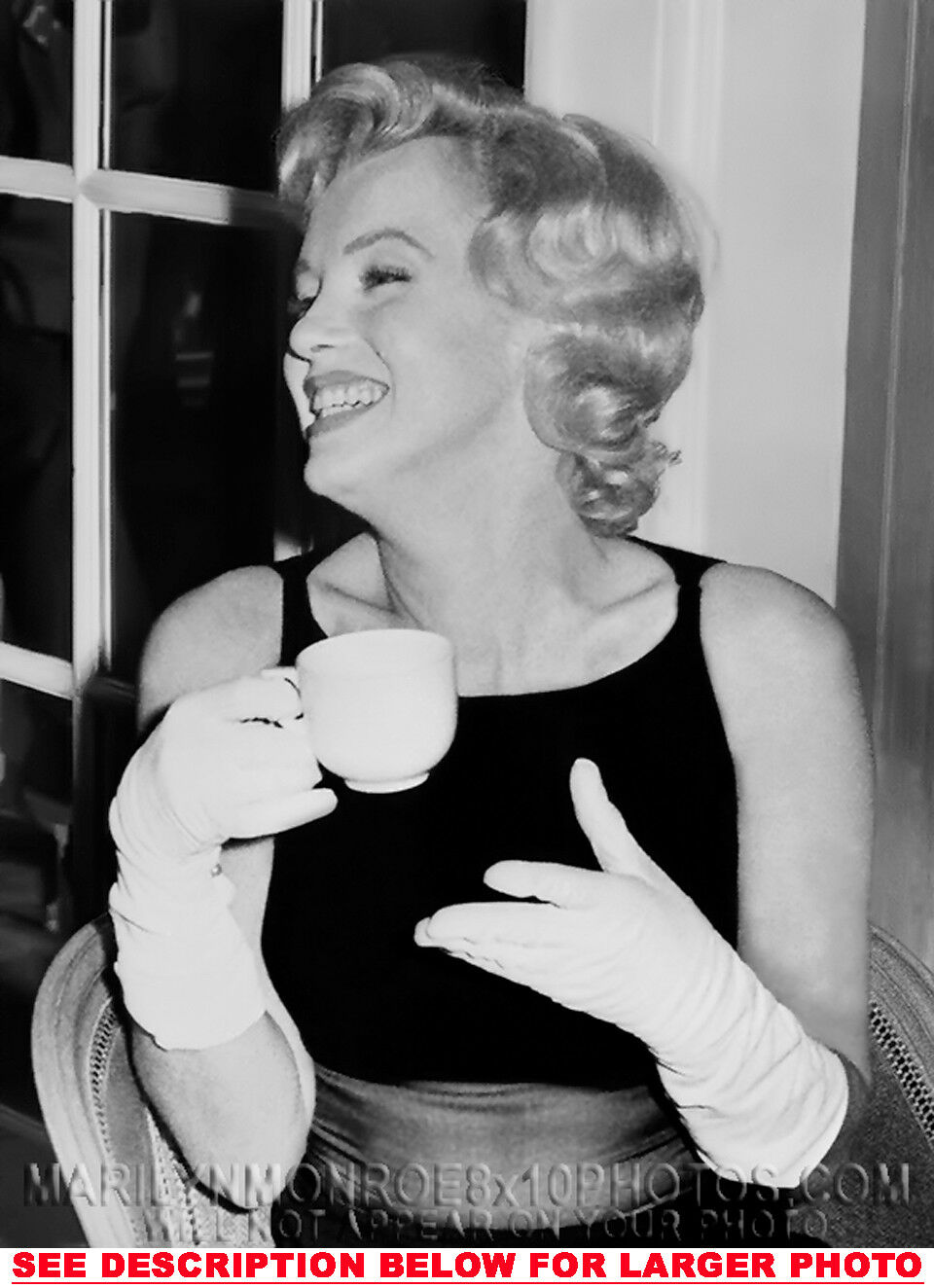 YOU ARE PURCHASING 1 CANDID & RARE MARILYN MONROE COFFEE in WHITEGLOVES (1) 5X7 FINE ART PHOTO The (1) 5X7 Candid & Fine Art Photo you will receive, (shown below) is from a Private Collection. COPYRIGHTS: (please see bottom of thispage) This Candid, One of a kind picture is Professionally photo-printed utilizing the GICLEE printing process onto GALERIE SmoothGloss Archival & Acid-free High Resolution Photo-Lab quality paper. As well, we use only Giclee pressheated Archival Printing Inks. This is Kodak's most expensive Ink, which creates higher & more vivid quality Photos & longer lasting prints than any other Photographic Ink in the world!! This Ultra Premium Kodak Super Color/Photo Gloss Pigment Based Printing Ink also shields photos from the key factors that lead to fading such as light, air, pollution, moisture and heat. This is due to the Spectacularly Innovative "colorlast" technology applied to this KodakPIGMENTInk, which allows your Photo to virtually resist any picture fading for at least 100 years. Meaning, the vibrant colors in the Photo you see below will be the exact same vibrant colors your descendants will see when viewing your Photo 100 years from now! NOTE PLEASE** WE ARE ALWAYS LISTING DIFFERENT MARILYN MONROE PHOTOS & PHOTO CREATIONS. IFYOU WOULD LIKE TO BE NOTIFIED THE NEXT TIME WE LIST MORE UNIQUE AND DIFFERENT PHOTOS OF MARILYN MONROE PLEASE US  5X7 PHOTO#1 CLICK HERE TO VIEW MORE MARILYN MONROE 5X7PHOTOS!