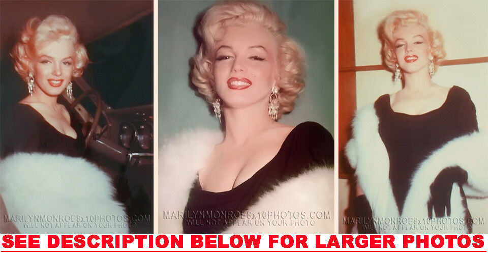YOU ARE PURCHASING 3 CANDID & RARE MARILYN MONROE DIAMONDS and WHITE FUR (3) 5X7 FINE ART PHOTOS The (3) 5X7 Candid & Fine Art Photos you will receive, (shown below) are from a Private Collection. COPYRIGHTS: (please see bottom of thispage) These Candid, One of a kind pictures are Professionally photo-printed utilizing the GICLEE printing process onto GALERIE SmoothGloss Archival & Acid-free High Resolution Photo-Lab quality paper. As well, we use only Giclee pressheated Archival Printing Inks. This is Kodak's most expensive Ink, which creates higher & more vivid quality Photos & longer lasting prints than any other Photographic Ink in the world!! This Ultra Premium Kodak Super Color/Photo Gloss Pigment Based Printing Ink also shields photos from the key factors that lead to fading such as light, air, pollution, moisture and heat. This is due to the Spectacularly Innovative "colorlast" technology applied to this KodakPIGMENTInk, which allows your Photos to virtually resist any picture fading for at least 100 years. Meaning, the vibrant colors in the Photos you see below will be the exact same vibrant colors your descendants will see when viewing your Photos 100 years from now! NOTE PLEASE** WE ARE ALWAYS LISTING DIFFERENT MARILYN MONROE PHOTOS & PHOTO CREATIONS. IFYOU WOULD LIKE TO BE NOTIFIED THE NEXT TIME WE LIST MORE UNIQUE AND DIFFERENT PHOTOS OF MARILYN MONROE PLEASE EMAIL US  5X7 PHOTO#1 5X7 PHOTO#2 5X7 PHOTO#3 CLICK HERE TO VIEW MORE MARILYN MONROE 5X7PHOTOS!
