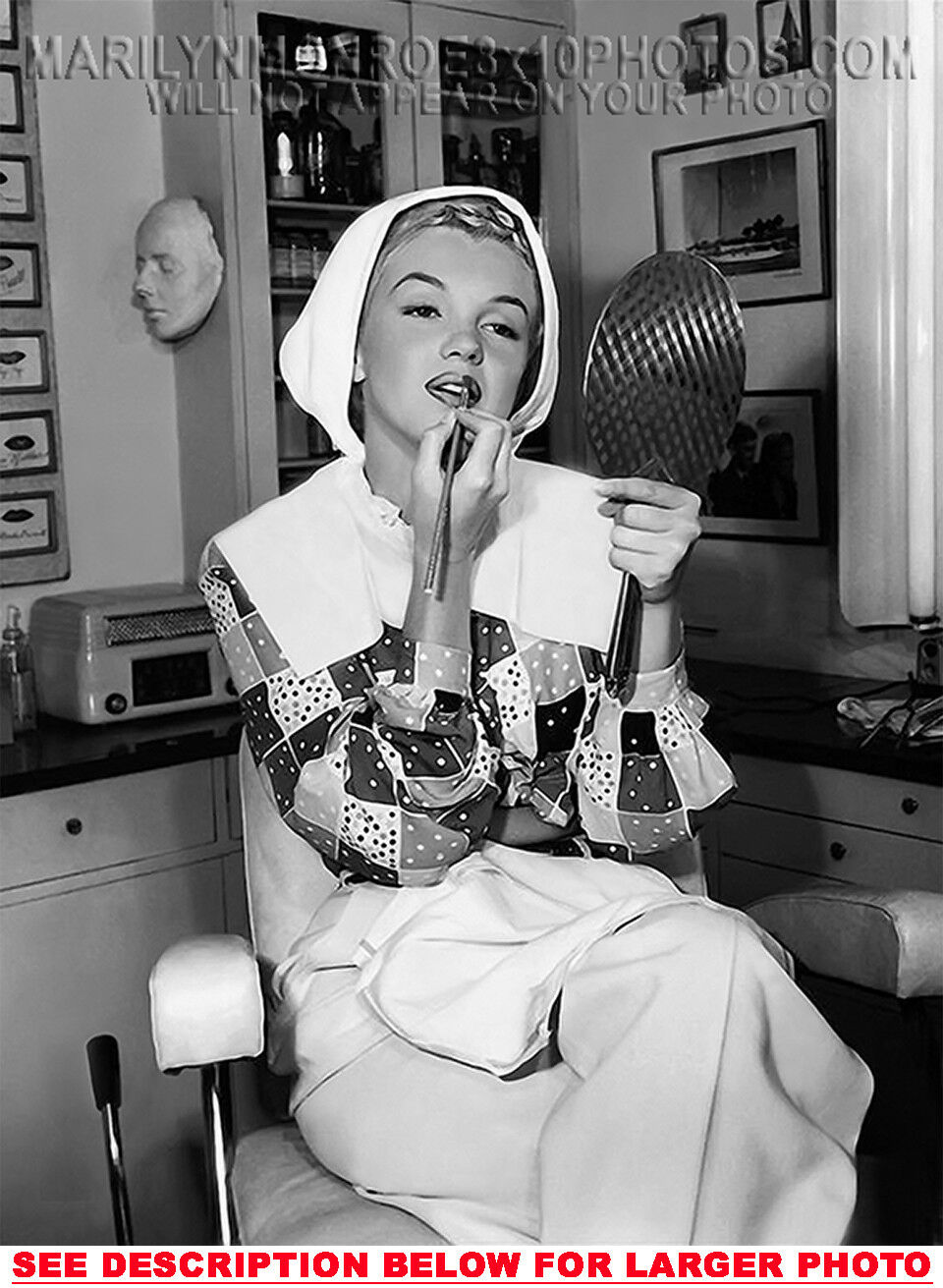 YOU ARE PURCHASING 1 CANDID & RARE MARILYN MONROE DOING HER OWN MAKEUP (1) 5X7 FINE ART PHOTO The (1) 5X7 Candid & Fine Art Photo you will receive, (shown below) is from a Private Collection. COPYRIGHTS: (please see bottom of thispage) This Candid, One of a kind picture is Professionally photo-printed utilizing the GICLEE printing process onto GALERIE SmoothGloss Archival & Acid-free High Resolution Photo-Lab quality paper. As well, we use only Giclee pressheated Archival Printing Inks. This is Kodak's most exDOING HER OWN MAKEUP Ink, which creates higher & more vivid quality Photos & longer lasting prints than any other Photographic Ink in the world!! This Ultra Premium Kodak Super Color/Photo Gloss Pigment Based Printing Ink also shields photos from the key factors that lead to fading such as light, air, pollution, moisture and heat. This is due to the Spectacularly Innovative "colorlast" technology applied to this KodakPIGMENTInk, which allows your Photo to virtually resist any picture fading for at least 100 years. Meaning, the vibrant colors in the Photo you see below will be the exact same vibrant colors your descendants will see when viewing your Photo 100 years from now! NOTE PLEASE** WE ARE ALWAYS LISTING DIFFERENT MARILYN MONROE PHOTOS & PHOTO CREATIONS. IFYOU WOULD LIKE TO BE NOTIFIED THE NEXT TIME WE LIST MORE UNIQUE AND DIFFERENT PHOTOS OF MARILYN MONROE PLEASE EMAIL US  5X7 PHOTO#1 CLICK HERE TO VIEW MORE MARILYN MONROE 5X7PHOTOS!