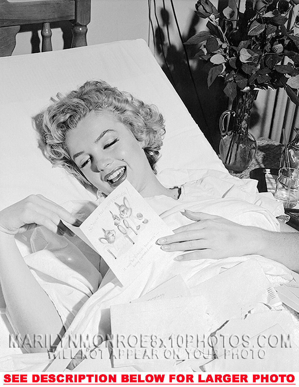 YOU ARE PURCHASING 1 CANDID & RARE MARILYN MONROE GET WELL SOON CARD (1) 5X7 FINE ART PHOTO The (1) 5X7 Candid & Fine Art Photo you will receive, (shown below) is from a Private Collection. COPYRIGHTS: (please see bottom of thispage) This Candid, One of a kind picture is Professionally photo-printed utilizing the GICLEE printing process onto GALERIE SmoothGloss Archival & Acid-free High Resolution Photo-Lab quality paper. As well, we use only Giclee pressheated Archival Printing Inks. This is Kodak's most expensive Ink, which creates higher & more vivid quality Photos & longer lasting prints than any other Photographic Ink in the world!! This Ultra Premium Kodak Super Color/Photo Gloss Pigment Based Printing Ink also shields photos from the key factors that lead to fading such as light, air, pollution, moisture and heat. This is due to the Spectacularly Innovative "colorlast" technology applied to this KodakPIGMENTInk, which allows your Photo to virtually resist any picture fading for at least 100 years. Meaning, the vibrant colors in the Photo you see below will be the exact same vibrant colors your descendants will see when viewing your Photo 100 years from now! NOTE PLEASE** WE ARE ALWAYS LISTING DIFFERENT MARILYN MONROE PHOTOS & PHOTO CREATIONS. IFYOU WOULD LIKE TO BE NOTIFIED THE NEXT TIME WE LIST MORE UNIQUE AND DIFFERENT PHOTOS OF MARILYN MONROE PLEASE EMAIL US  5X7 PHOTO#1 CLICK HERE TO VIEW MORE MARILYN MONROE 5X7PHOTOS!