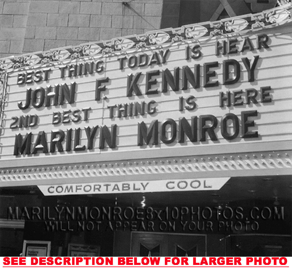YOU ARE PURCHASING 1 CANDID & RARE MARILYN MONROE JFK HONORS MARQUEE (1) 8x10 FINE ART PHOTO The (1) 8x10 Candid & Fine Art Photo you will receive, (shown below) is from a Private Collection. COPYRIGHTS: (please see bottom of thispage) This Candid, One of a kind picture is Professionally photo-printed utilizing the GICLEE printing process onto GALERIE SmoothGloss Archival & Acid-free High Resolution Photo-Lab quality paper. As well, we use only Giclee pressheated Archival Printing Inks. This is Kodak's most expensive Ink, which creates higher & more vivid quality Photos & longer lasting prints than any other Photographic Ink in the world!! This Ultra Premium Kodak Super Color/Photo Gloss Pigment Based Printing Ink also shields photos from the key factors that lead to fading such as light, air, pollution, moisture and heat. This is due to the Spectacularly Innovative "colorlast" technology applied to this KodakPIGMENTInk, which allows your Photo to virtually resist any picture fading for at least 100 years. Meaning, the vibrant colors in the Photo you see below will be the exact same vibrant colors your descendants will see when viewing your Photo 100 years from now! NOTE PLEASE** WE ARE ALWAYS LISTING DIFFERENT MARILYN MONROE PHOTOS & PHOTO CREATIONS. IFYOU WOULD LIKE TO BE NOTIFIED THE NEXT TIME WE LIST MORE UNIQUE AND DIFFERENT PHOTOS OF MARILYN MONROE PLEASE EMAIL US  8x10 PHOTO#1  CLICK HERE TO VIEW MORE MARILYN MONROE 8x10PHOTOS!