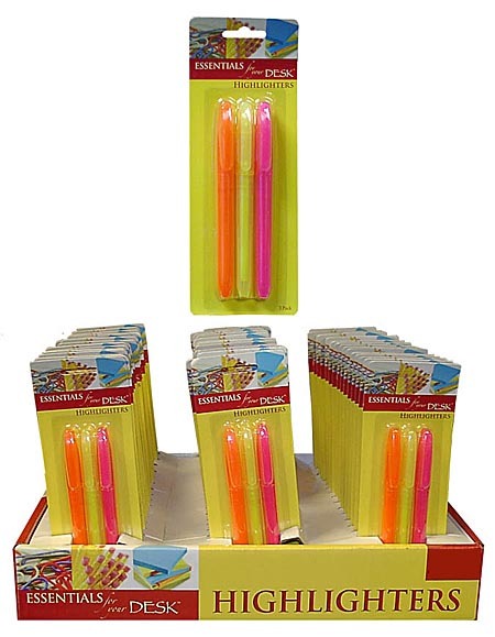 A 3 pack of neon pen style highlighters. There's orange, pink, and yellow with pocket clip caps. The set of 3 come in blister card package with UPC code. Comes with a cardboard shelf display box."" Case Pack 48 Please note: If there is a color/size/type option, the option closest to the image will be shipped (Or you may receive a random color/size/type).