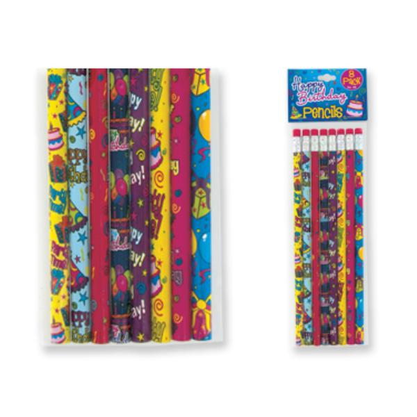 Birthday Pencils Celebrate with style! Eight colorful and fun pencils for the special birthday boy or girl. Great for classroom celebrations or birthday goodie bags. Eight in all Colorful designs Case Pack 72 Please note: If there is a color/size/type option, the option closest to the image will be shipped (Or you may receive a random color/size/type).