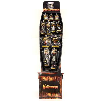 Assorted Glow in the Dark COFFIN DISPLAY comes with multiple assorted pieces and designs. There are also assorted colors. Price is per display. Includes 7 different pieces:18 necklaces, 18 bracelets, 36 mouth pieces, 24 6"""" glow sticks, 12 ghost figures and 10 each of a bracelet and necklace."" Case Pack 128 Please note: If there is a color/size/type option, the option closest to the image will be shipped (Or you may receive a random color/size/type).