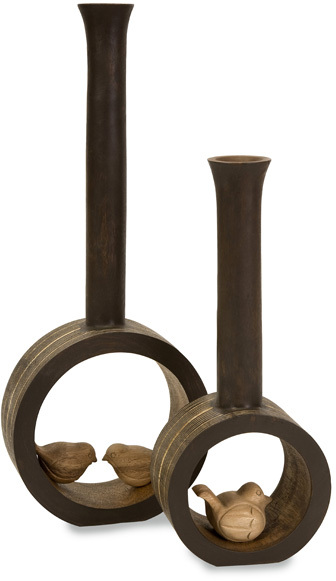 Adaya Wood Carved Bird Vases - Set of 2 The Adaya vases feature hand-carved birds playfully perched inside a hollow ring base. This set of two is made from 100% mango wood. 100% Mango Wood (13-18""""h x 5.5-7.5""""w x 3"""") "" Sold Individually Please note: If there is a color/size/type option, the option closest to the image will be shipped (Or you may receive a random color/size/type).