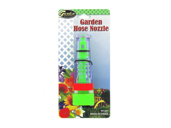 This adjustable hose nozzle is perfect for gardening. Comes in assorted colors. Packaged on a blister card with UPC. Measurements: 4" This item is sold as an assortment. There are no options to choose from the shipment will be based on what is available at the time of order.; Colors: yellowgreen; Materials: plasticIf there is a color/size/type option the option closest to the image will be shipped (Or you may receive a random color/size/type).