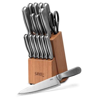 Ginsu Kotta series 16 piece Stainless Steel Cutlery Set with Bamboo Block... Kotta Series blades are made from commercial quality stain and rust resistant stainless steel that is well known for it's sharpness and strength. Stainless Steel Handles are beautifully shaped and ergonomically designed to fit smoothly into your hand. commercial quality steel tang extends into the handle. Bamboo Storage Block is made from richly grained bamboo and designed to protect your fine cutlery when not in use.. Set Includes 8"" Chef's Knife 8"" Slicer 8"" Bread Knife 7"" Santoku 6.5"" Cleaver 5.5"" Boning Knife 5"" Serrated Utility Knife Six 4.5"" Steak Knives 3.5"" Paring Knife Kitchen Shears Bamboo Storage Block.