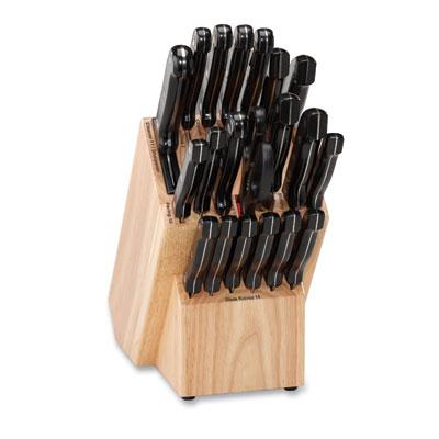Ronco Rocker 20-Piece Knife and Wooden Block Set (Classic Box)... This expansive cutlery set includes Ronco Rocker 14-1/2-inch all-purpose knife 13-1/4-inch bread and bagel knife 13-1/8-inch chef's knife 14-1/2-inch saw knife 12-3/4-inch boning knife 11-7/8-inch sportsman knife 11-inch cheese knife 11-7/8-inch cleaver 9-3/8-inch utility knife 9-1/4-inch chop-and-serve knife 8-1/4-inch poultry/kitchen shears (6) 9-1/4-inch steak knives and (2) 7-3/4-inch paring knives; high carbon stainless-steel blades feature hand-sharpened edges. Full tang and triple-riveted construction to securely attach handles.