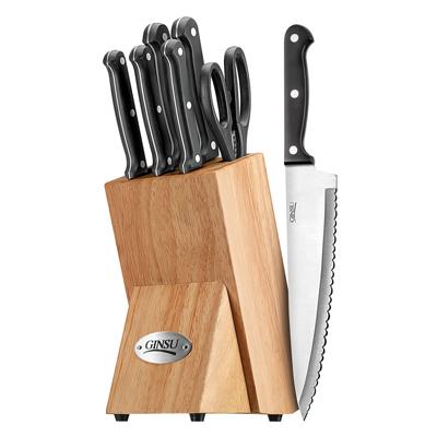 Ginsu Essential Series 8-piece Cutlery Set with Natural finish Block... Essential Series blades are made from commercial quality stain and rust resistant stainless steel that is well known for its sharpness and strength. Triple Rivet Handles are beautifully shaped and ergonomically designed to fit smoothly into your hand. Commercial quality steel tang extend through the entire triple riveted handle. Hardwood Storage Block is made from richly grained wood and designed to protect your fine cutlery when not in use. Includes 8"" Chef's Knife 8"" Slicer 7"" Santoku Knife 5"" Boning Knife 4.5"" Utility Knife 3.5"" Paring Knife Kitchen Shears Natural finish Hardwood Storage Block.