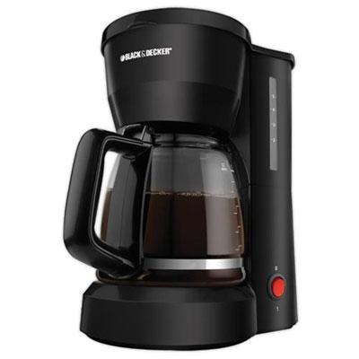 Black and Decker 5 cup Coffeemaker with Black finish. With a compact design and handy cord storage this coffeemaker is a great value for small spaces such as apartments condos and around the office. With onetouch operation and a nonstick Keep Hot plate you can have hot coffee anytime without a hassle. FEATURE. Removable Filter Basket Nonstick Keep Hot Carafe Plate. Coffee and Water Carafe Markings. Cord Storage. One Piece Cover Easy View Water Window.