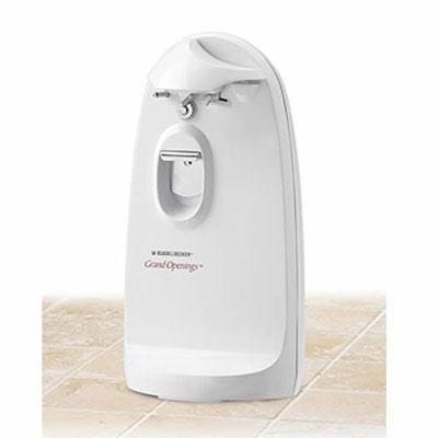 Black and Decker Grand Openings Can Opener.The Grand Openings extra tall can opener handles even large coffee or tall juice cans. The power pierce cutter and automatic shutoff allow for hands free operation while a built in bottle opener and knife sharpener extend the versatility. Opens big and extra tall cans. Power pierce cutter with auto off. Built in knife sharpener and bottle opener. Removable blade for easy cleaning. Hideaway cord storage area.
