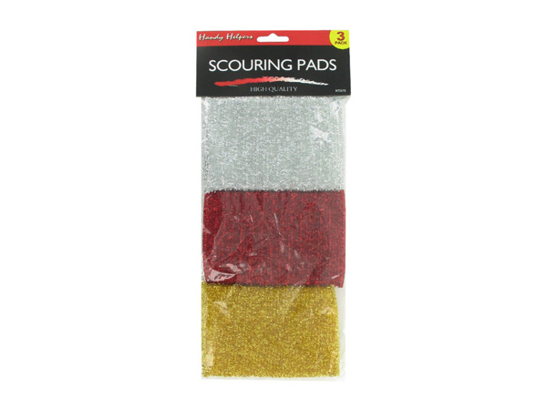 These high-quality scouring pads are ideal for a number of household uses including cleaning dishes and other items as well as basic cleaning tasks like cleaning bathrooms and floors. One each silver red and gold allows for color coordination of the jobs. Colors: redsilvergold; If there is a color/size/type option the option closest to the image will be shipped (Or you may receive a random color/size/type).