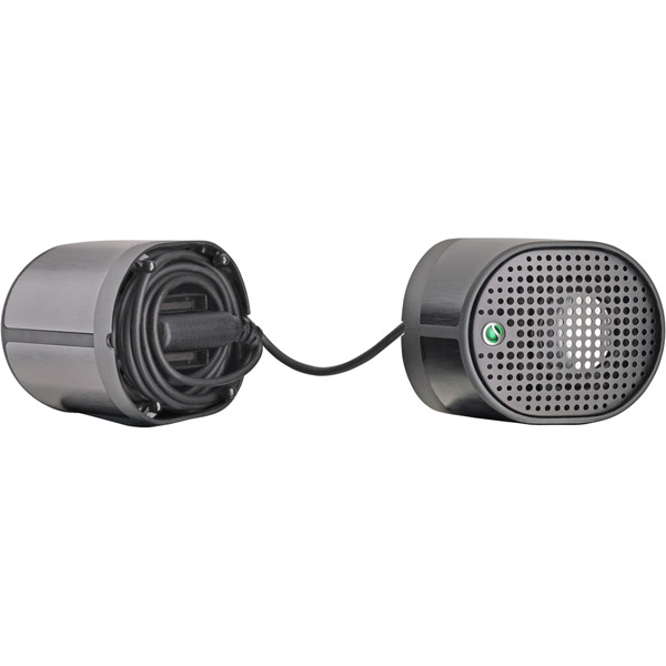 Separate the 2 speakers to turn into a mini-stereo system Plugs into any 3.5mm audio deviceno batteries requiredSeamlessly switch between music and incoming callsmusic auto-stops when call is receivedFM radio with integrated antenna cableCord management located inside when speakers are connectedSmall and compactfits in pocket or small bag