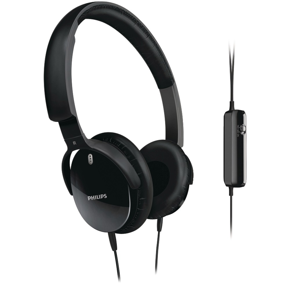 PHILIPS SHN5200/28 ON-EAR NOISE CANCELING HEADPHONES ACTIVE NOISE CANCELING ELIMINATES UNWANTED EXTERNAL NOISE BY 75%; SMART NOISE CANCELING TECHNOLOGY ENHANCES LISTENING A LOWER VOLUME LEVELS IN NOISY ENVIRONMENTS; SOFT EAR CUSHIONS PROVIDE PERFECT SEAL FOR PERFECT SOUND; EASY ADJUSTABLE HEADBAND ENSURES OPTIMUM FIT & COMFORT; SLIM LIGHTWEIGHT CONTROLS FOR POWER & VOLUME ADJUSTMENT; ADAPTER FOR IN-FLIGHT ENTERTAINMENT SYSTEM CONNECTION; INCLUDES BATTERY