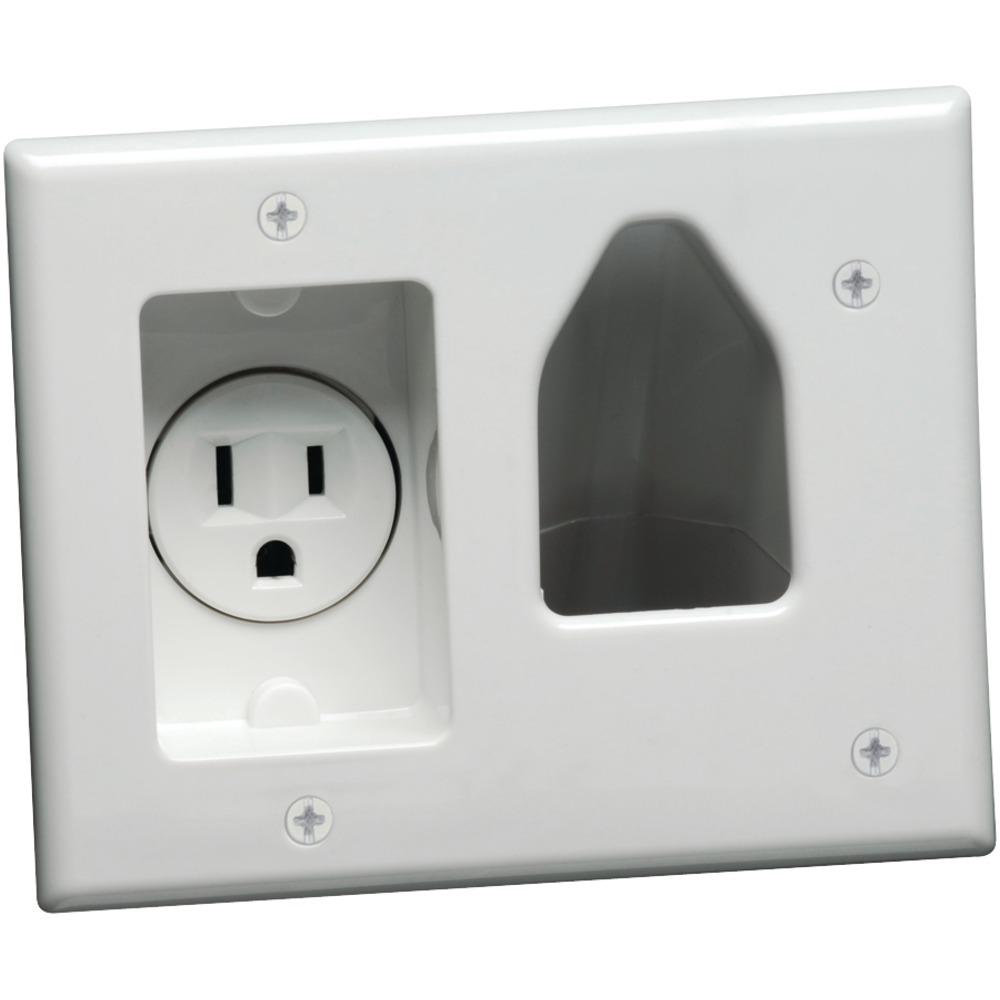 DATACOMM ELECTRONICS 45-0021-WH 2-GANG RECESSED LOW-VOLTAGE CABLE PLATE WITH RECESSED POWER (WHITE) RECESSED CABLE PLATE; BUILT-IN RECESSED POWER OUTLET; 2 GANG; USED TO INSTALL LOW VOLTAGE CABLES BEHIND FLAT PANEL TVS, AMPLIFIER OR OTHER A/V DEVICES; FLUSH TO THE WALL SURFACE; ALLOWS CABLE MANAGEMENT INTERNALLY RATHER THAN EXTERNALLY; FOR PROFESSIONAL INSTALLATION; 10-YEAR WARRANTY; WHITE