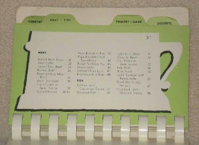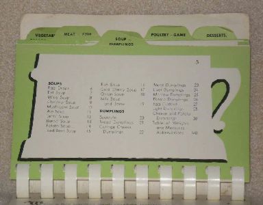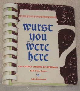 | Up for your consideration an original copyright 1954 Wurst You Were Here Choice Cuisine of Germany Fully Illustrated Recipe Index Card Booklet by Ruth Chier Rosen in excellent condition, no markings only very light wear, light spots on back, 140 pages in rare index card form, tabs index one of a kind unique recipes including Soup & Dumplings, Meat, Fish, Poultry and Game, Vegetables, Salads & Sauces and Desserts. This timeless booklet has it all including menus for each category and packed with information. The best description are the pictures, as included are some of the contents and condition. Please look at all the pictures for more details.