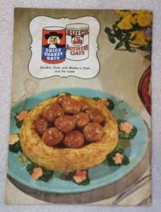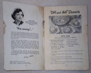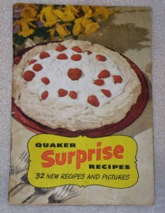 Up for your consideration a very rare 1955 Quaker Surprise Recipes by Mary Alden booklet in acceptable condition, no markings, a few small spots inside, stains on inside cover which has partially separated from book by one of the two staples, the other holding tight, 27 pages with one of a kind unique recipes desserts such as Peek-a-boo cookies, Raggedy Ann peanut cookies, Two-Way orange date cookies, 6 Way cookies, an of course the famous Raisin apple and Old-Fashioned oatmeal cookies to name a few. Also included are main dish recipes such as Beef Roulades, Broiled Humdingers, Glazed ham balls, the famous Juicy meat loaf and much more. The best description are the pictures, as included are some of the contents and condition. Booklet will ship in acid free sleeve and backing. Please look at all the pictures for more details.