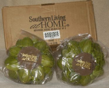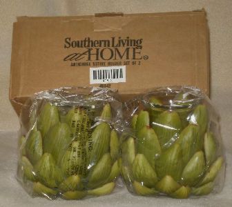 Up for your consideration a rare authentic original Southern Living at Home Artichoke Votive Holder 1 set of 2 new in original box. Each measure 4 1/2" in diameter, 3 1/2" tall and includes two glass votive holders. These realistic artichokes almost make you want to pull out the dip, are very hard to find new so do not let this set get away! Please look at the pictures for more details.