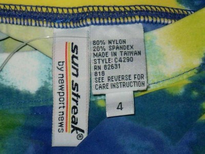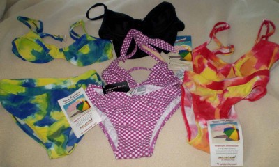 Up for bid a lot of three new with tag sexy 2 Piece bathing suits with bonus new black tankini top by NewPort News Sun Streak Shape FX size 4 Misses. These cute yellow, green and blue mixed, orange, red and yellow mixed and purple and white suits are just in time for fun at the beach pool or hot tub, and will fit junior size small or misses size 2-4, bust size 32a or 32b. Waist size 24 1/2 to 25 1/2 and will stretch to 26". hip size 34 1/2 to 35 1/2 and will stretch to 36" just in case you add more junk to your trunk. The top measures 24" long and has removable pads, and can be adjusted to fit in back by the two openings for the closer hook, and also adjustable straps. The purple and white ties in back and adjust at the bust for more or less coverage. Also included a size 4 new with tag black tankini (top only) you could wear with anything! These suits will turn heads for all the right reasons! Get all for one shipping rate!! Please look at all the pictures for more details. Do not let this deal get away!