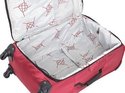 The trolley system has a push button locking handle and is constructed from a single piece of aluminum and runs down the sides of the bag, leaving the bed of the case flat and crease free