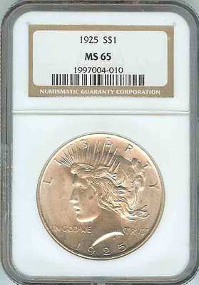 Coin: Peace US Silver Dollar Year: 1925-P Graded By: NGC Grade: MS65 Bonus: Free shipping from a US Seller! Notes: Great coin with great natural satin like luster.