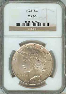 Coin: Peace US Silver Dollar Year: 1925-P Graded By: NGC Grade: MS64 Bonus: Free shipping from a US Seller! Notes: Great coin with natural luster and light natural toning.