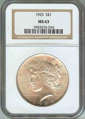 Coin: Peace US Silver Dollar Year: 1925-P Graded By: NGC Grade: MS63 Bonus: Free shipping from a US Seller! Notes: Great coin with great deep natural luster.