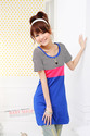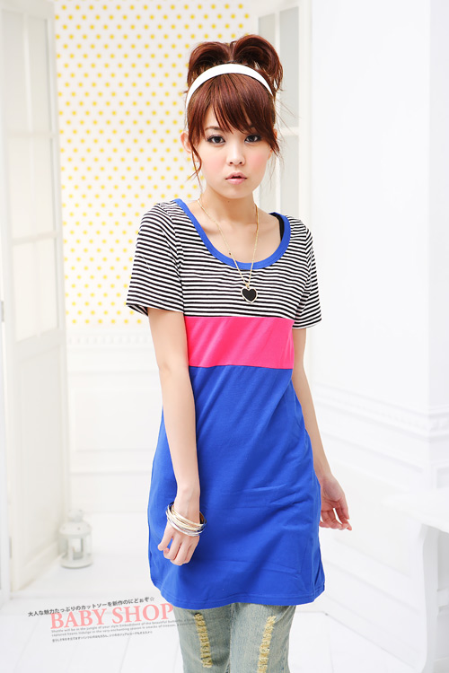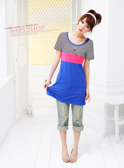 Korean Style Upper Striped Color Matching Dress Blue
