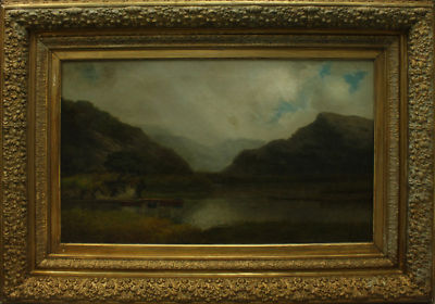 | | Welcome to Cornell Gallery's Famous $9.99 No-Reserve Art Auctions! Sounds Too Good To Be True?.... Check Out Our Feedback And See What Our Happy Clients Have To Say About Us!!!! And Please Remember to Browse Our Other Current Listings at http://stores.ebay.com/stevecornellgallery - We List 10-15 New Pieces EVERY DAY! This museum quality Antique landscape you are about to bid on is an original 1881 oil on canvas by the extremely talented, critically acclaimed, and LISTED American artist George F. Fuller (1822-1884). Inspired by Corot and the French Barbizon painters, Fuller found great success creating moody figural works and landscapes in brown tones, with textured, painterly surfaces. Landscapes, like this one in particular, won him great acclaim in his time, and have since been exhibited throughout the United States. Deriving its visual appeal from a reliance on longstanding landscape practices and late-eighteenth-century British aesthetic theories of the Sublime and the Picturesque, this image, both in technique and style, stands out amongst its contemporaries. Fuller carefully balanced the composition, dividing the image in half and combining a mixture of rough and smooth contours to create a visually dynamic yet highly accessible painting. Its horizontal format and low vantage point accentuate the depth of the rocky precipices. The threatening clouds over the mountains add further tension to this otherwise placid composition, emphasizing the awe-inspiring, sometimes destructive, forces of nature.Unique and dynamic, this fantastic work would be the perfect acquisition for any fan of the genre and we're proud to offer it in eBay Auction! Don't miss the opportunity to add this rare and charming painting to your collection today! The image is signed & dated (1881) in the lower left. It measures 18" x 30" and 29" x 41" in its original gorgeous gold frame that perfectly complements the artwork, provided free of charge to our clients. Condition report: There are 2 old patches on the back....Can't see anything from the front where they are, so the repair was professional, and one small spot in center sky, where a touch up may have been done, no patch, otherwise the painting is in very good shape with minor wear. The fabulous original museum frame is in great shape with minor wear and tear as well. (Because our frames are always complimentary, we are not responsible for their condition, only for the condition of the artwork). The artist's work is a solid investment. Here is just one of his auction records (source: Artprice.com):