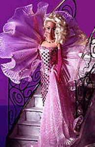 In a sleek strapless pink sheath gown and swirling pink iridescent wrap, Barbie doll makes her entrance. What a stunning vision of sophisticated elegance! Her dress features silvery dots, and accessories include pink opera-length gloves, dangling pink and clear crystal beaded earrings, and a beaded choker. Her blond hair is upswept into an alluring wave of golden locks.