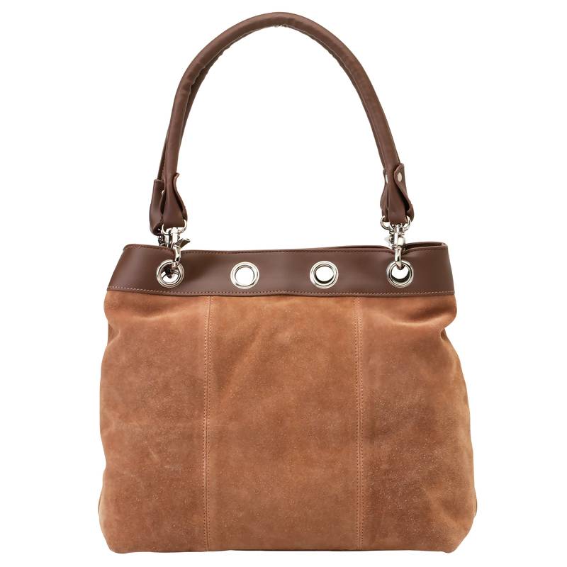 Features snap closure, inner lining, privacy and cell phone pockets, clip-on handle, and roomy interior. Measures 12" x 10" x 4".