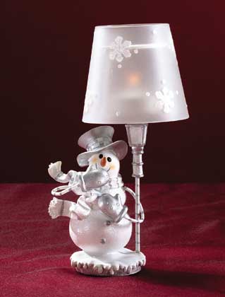 To add a soft glow on a winter's night, light up this lovely candle lamp. A glistening snowman stands by a lamp post, and pretty snowflakes decorate the frosted shade. Tealights only. Exclusive Alabastrite. 5 x 3 3/4 x 9 1/4 high.