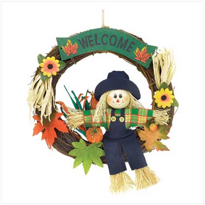 Adorn any entryway with the cheerful sights and splendid colors of a bountiful autumn harvest! A plaid-clad scarecrow smiles a cheery greeting from amongst his colorful bower of leaves and flowers, welcoming guests with a happy hint of fall. Straw and grapevine. 12" x 2" x 14 1/4" high.