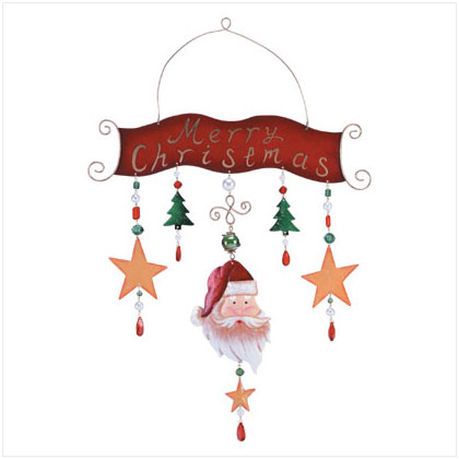 A unique Merry Christmas painted metal sign that is decorated with art glass and acrylic beads to look like a hanging mobile. Gold-tone frame. 15 1/4 x 24 high.
