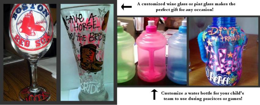 All glasses, cups and bottles are handpainted and make great unique gifts for anyone of any age!