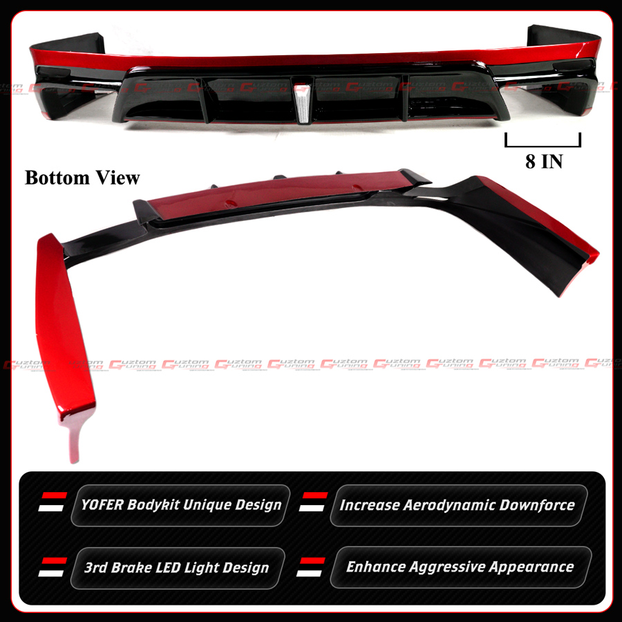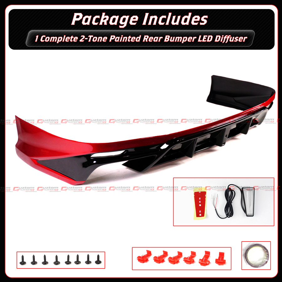 - Both Front Lip & Diffuser Is In Two Toned Supersonic Red & Gloss Black Finish. Please Note The Color Is Aftermarket Color, It's Not Factory Paint Match Color.