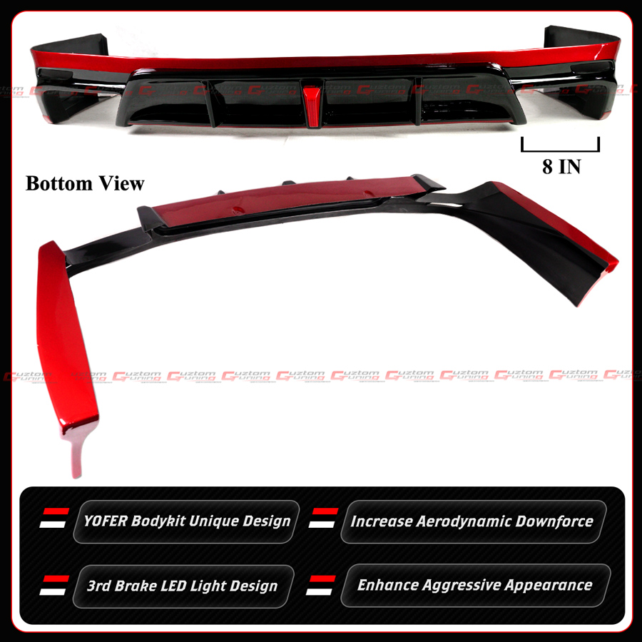 - The One Full Piece Structure Gives You The Most Integrated Look and Seamless Fitment. The Diffuser Also Features A Shark Fin Vortex Aerodynamic Dual Exhaust Design With Sleek F1 Style Brake Light. Please Note That Wiring And Spicing Is Needed For The LED Light.
