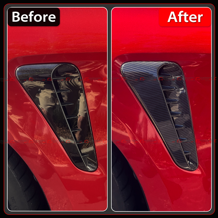 - Full Prepreg Carbon Fiber Front Fender Side Garnish Trim Covers For GR Corolla. This is The OE Style Full Size Cover Design, It Will Give You The Luxury Yet Sporty Look Right Away.