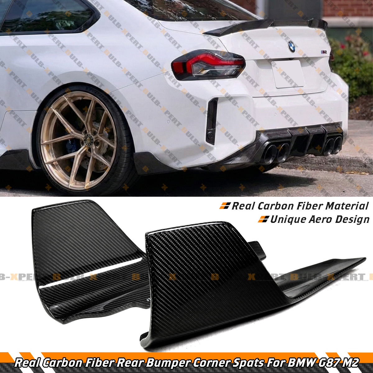 - Real Carbon Fiber V Style Rear Bumper Corner Extension Spats For G87 M2. This Features A Just-Right Winglet Design And Will be A Perfect Match With Your Carbon Fiber Diffuser.