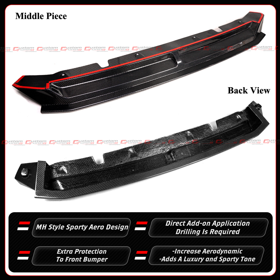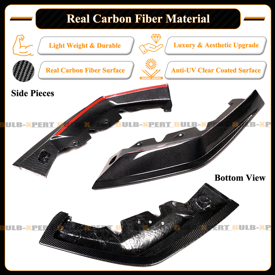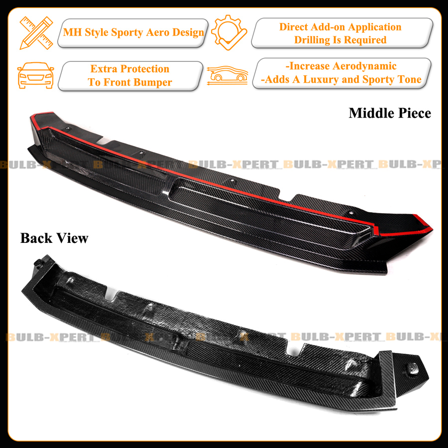 - Real Carbon Fiber MH Style 3pc Front Bumper Splitters Kit: Includes 2 Corner Splitters and Middle Lower Lip.